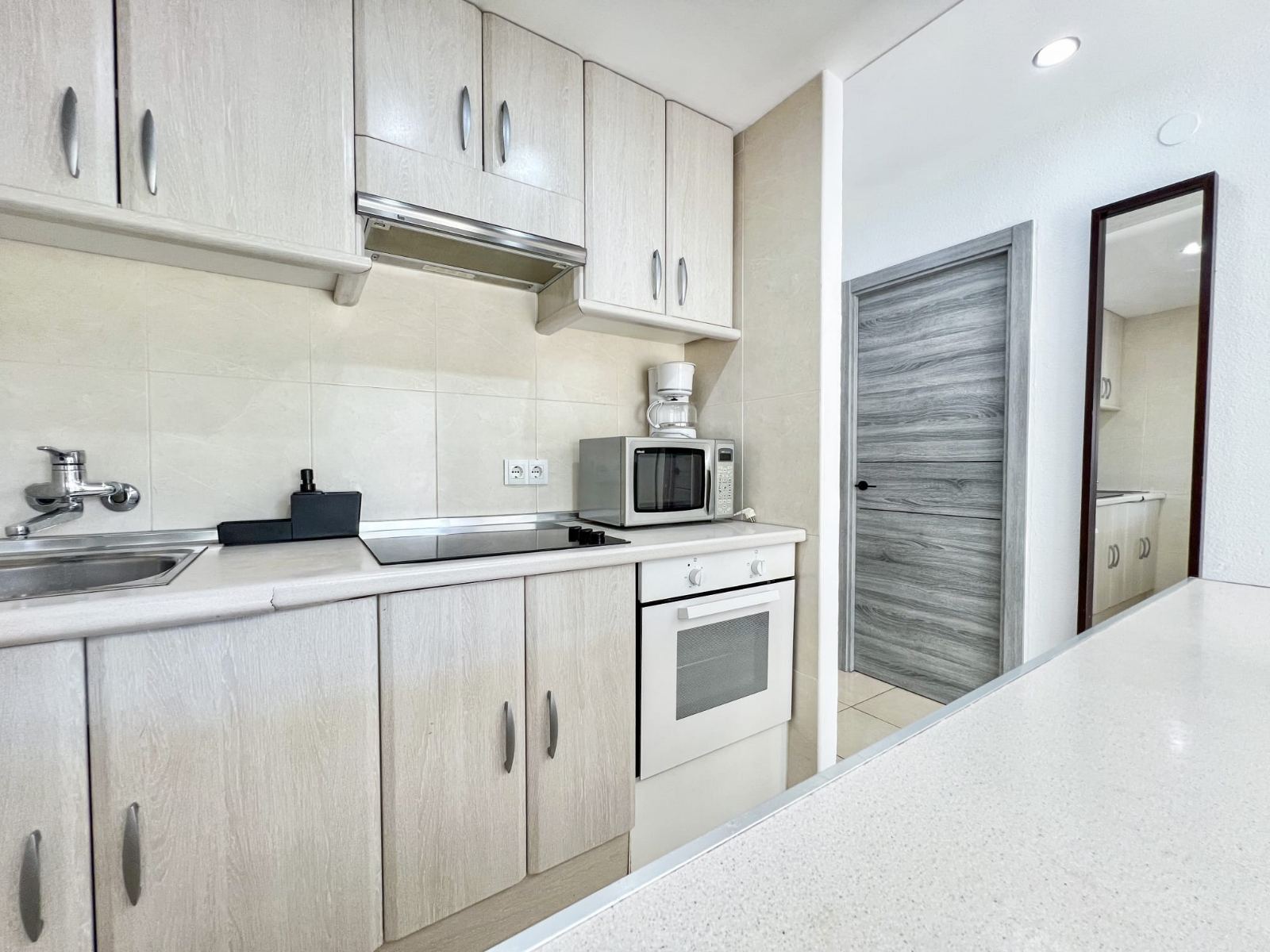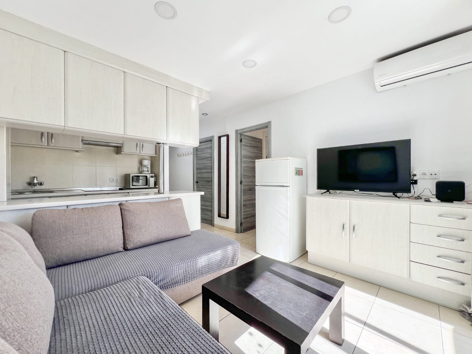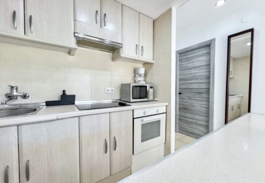 The apartment features an entrance hall with access to a southwest-facing terrace, providing plenty of afternoon sun and natural light. A very sunny terrace, a fully equipped open-plan kitchen, a master bedroom with a double bed and built-in wardrobe, a second bedroom, and a bathroom with a shower.