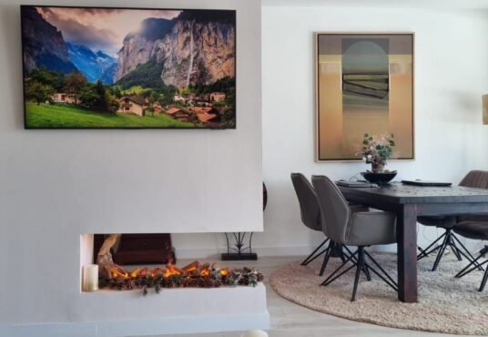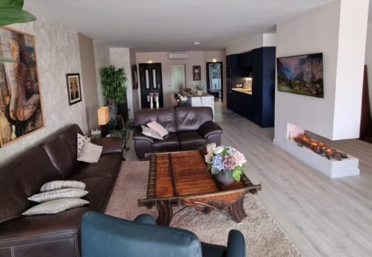 gardens and surrounding mountains. The apartment features a spacious and bright living and dining area with an integrated open-plan fully fitted kitchen equipped with Bosch