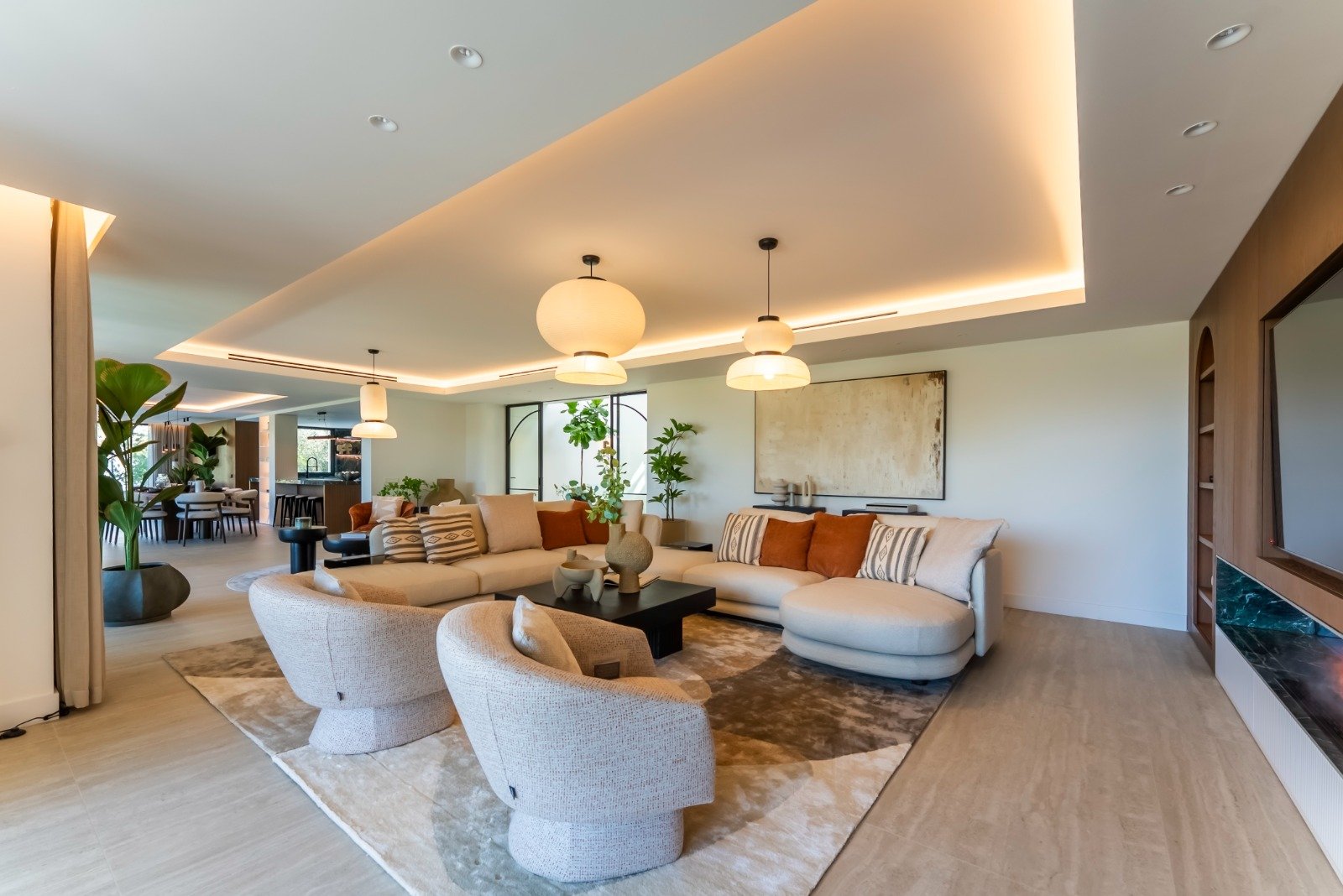 Desde el momento en que atraviesas la puerta, el espectacular atrio de 8 metros marca un tono de grandeza, llenando el espacio de luz y una sensación de amplitud. El diseño inteligente de planta abierta fluye sin esfuerzo entre zonas distintas pero conectadas: un elegante comedor, una cocina de diseño completamente equipada con electrodomésticos de alta gama, una acogedora sala de televisión y un rincón de café íntimo. Las amplias puertas correderas de suelo a techo se abren a un santuario exterior paisajístico impresionante, un espacio ideal tanto para el entretenimiento como para el descanso.